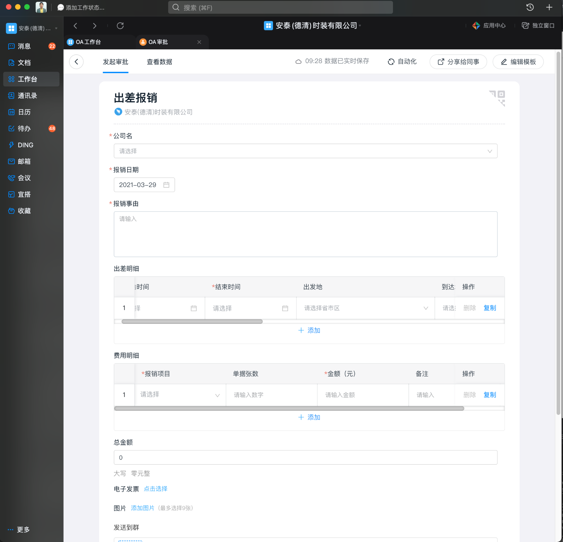 进入"出差报销",选择正确的公司名,填写出差明细和费用明细,完成后点提交等待审批,见图 2-1